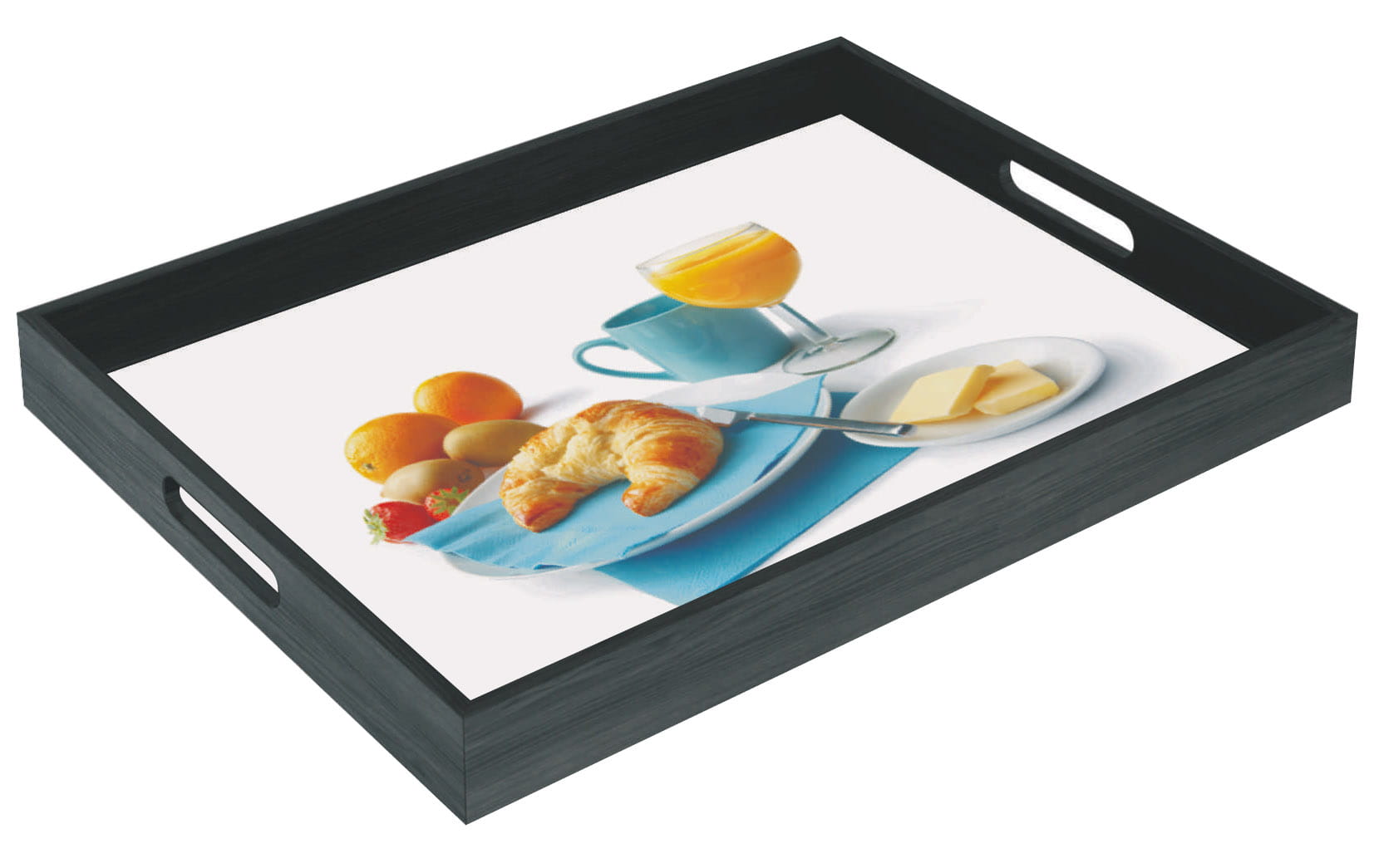 - Tray : stained and varnished wood with practical side handles .